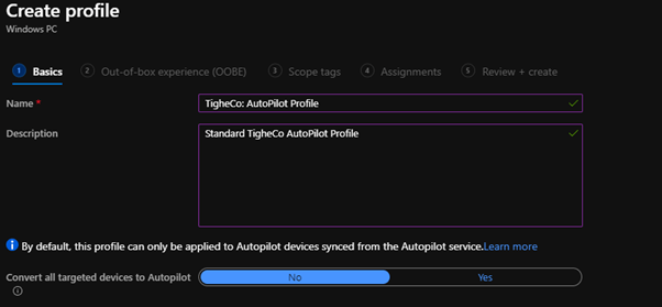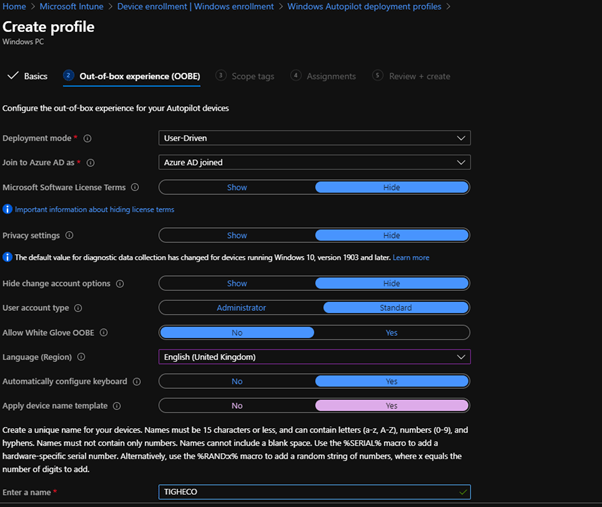 Now we need to create the Autopilot Deployment Profile. This is the profile that will be targeted at the machines to specify their configuration.