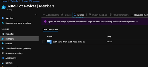 Also checking under the previously created AutoPilot Devices group we should see the device as a member of that group.