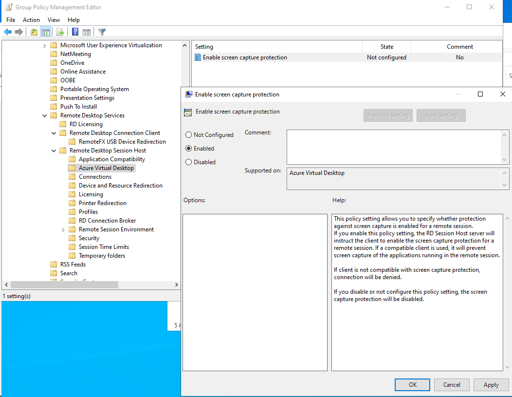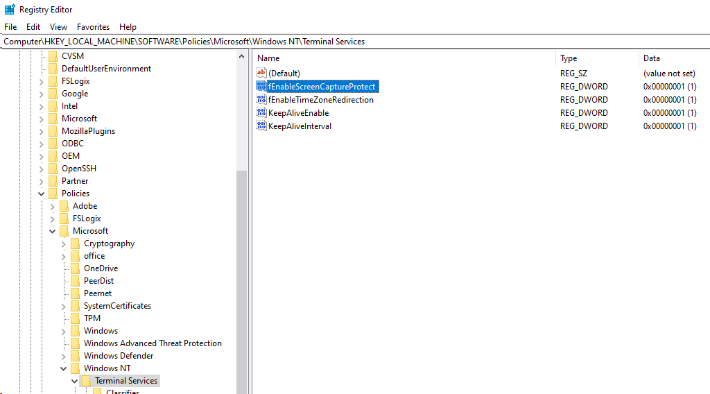 For the Screen Capture Protection to work we need to make a registry change on the Session Hosts. No obviously I would normal make this change on the golden image, or on mass via something like Microsoft EndPoint Manager.