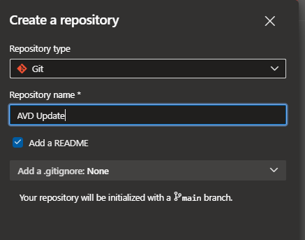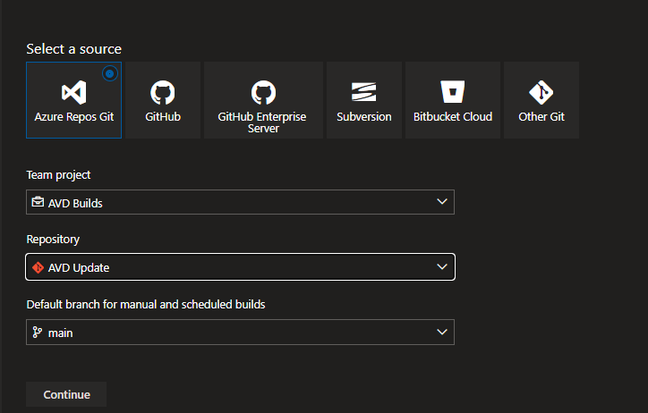Then select Azure Repos Git for the source, and select the newly created AVD Update repository