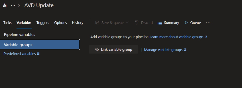 This variable group will then be attached to the Pipeline to allow these variables to be used.