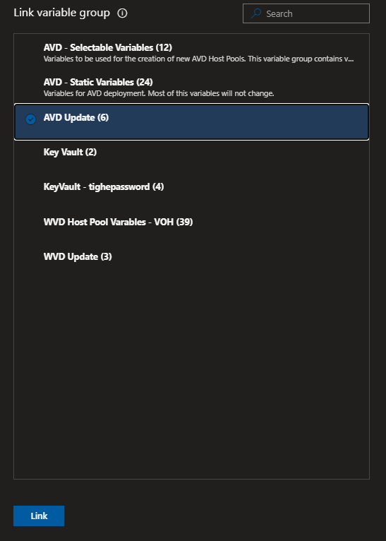 Then click Variable groups and the Link variable group option. Select the Variable Group and then Link.