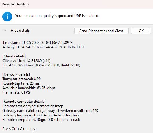 And we can see from the connection status that it’s pretty much maintaining 30+ FPS. Considering my AVD Session Host is in West Europe and I’m sat in South England that’s not too shabby!