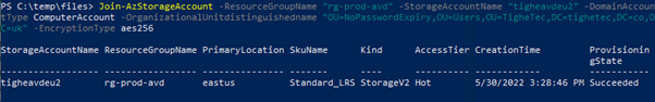 Join-AzStorageAccount -ResourceGroupName “rg-prod-avd” -StorageAccountName “tigheavdeu2” -DomainAccountType ComputerAccount -OrganizationalUnitDistinguishedName “OU=NoPasswordExpiry,OU=Users,OU=TigheTec,DC=TigheTec,DC=co,DC=uk” -EncryptionType AES256