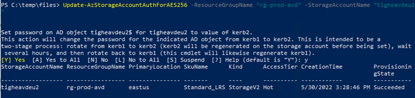 Update-AzStorageAccountAuthForAES256 -ResourceGroupName “rg-prod-avd” -StorageAccountName “tigheavdeu2”