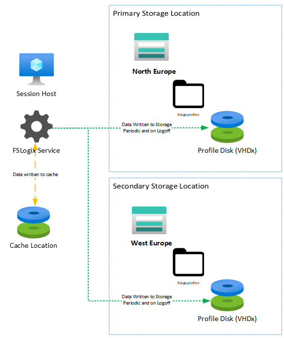 When the CCDLocations setting is used, data is written to a defined Cache location on the Session Host first, then the FSLogix service will periodically copy this data to all storage locations referenced in the settings.