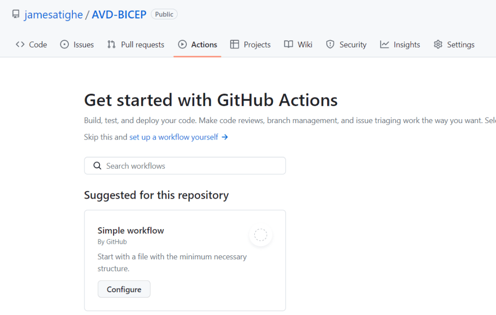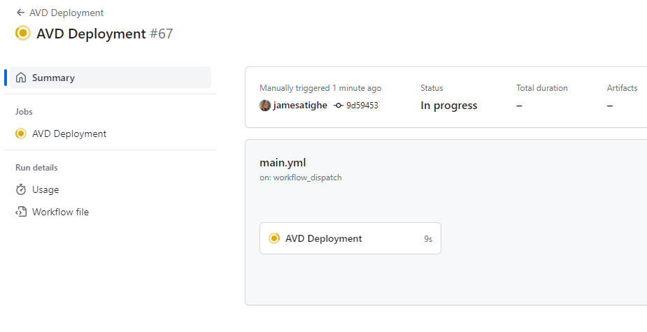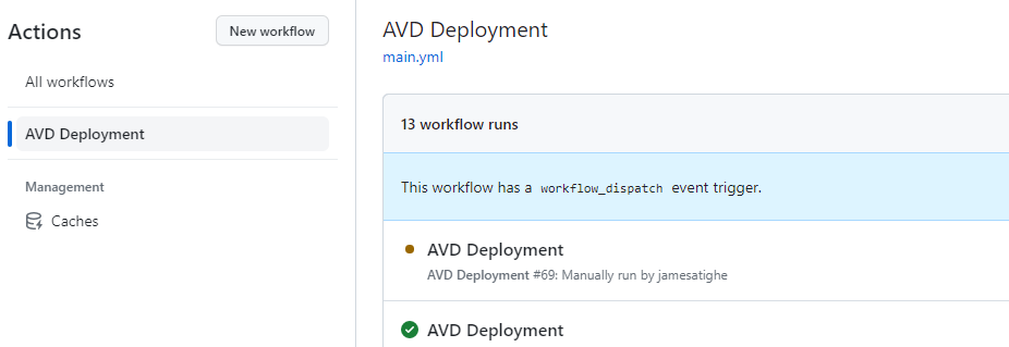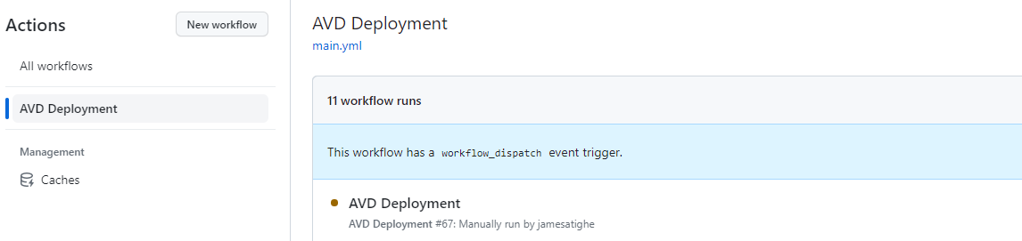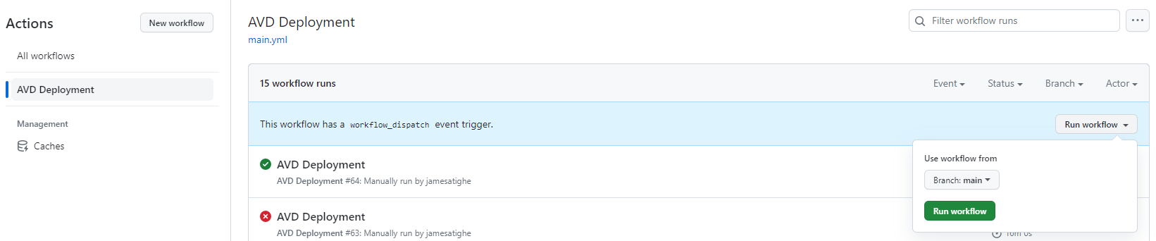 Next, select the relevant workflow. In my case, AVD Deployment then click Run workflow, leave as the main branch (unless your configuration is different) and click Run workflow
