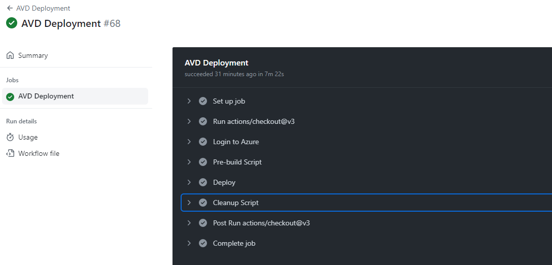 The last step for the AVD Deployment job is to run my magical Cleanup.ps1 script. This script is used to trigger if an Update deployment is run and will perform the draining and shutdown of the old Session Hosts.