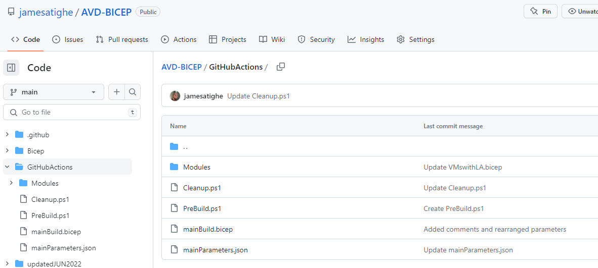 I have created a new folder called GitHubActions and copied the mainBuild.bicep and module files from my previous build.