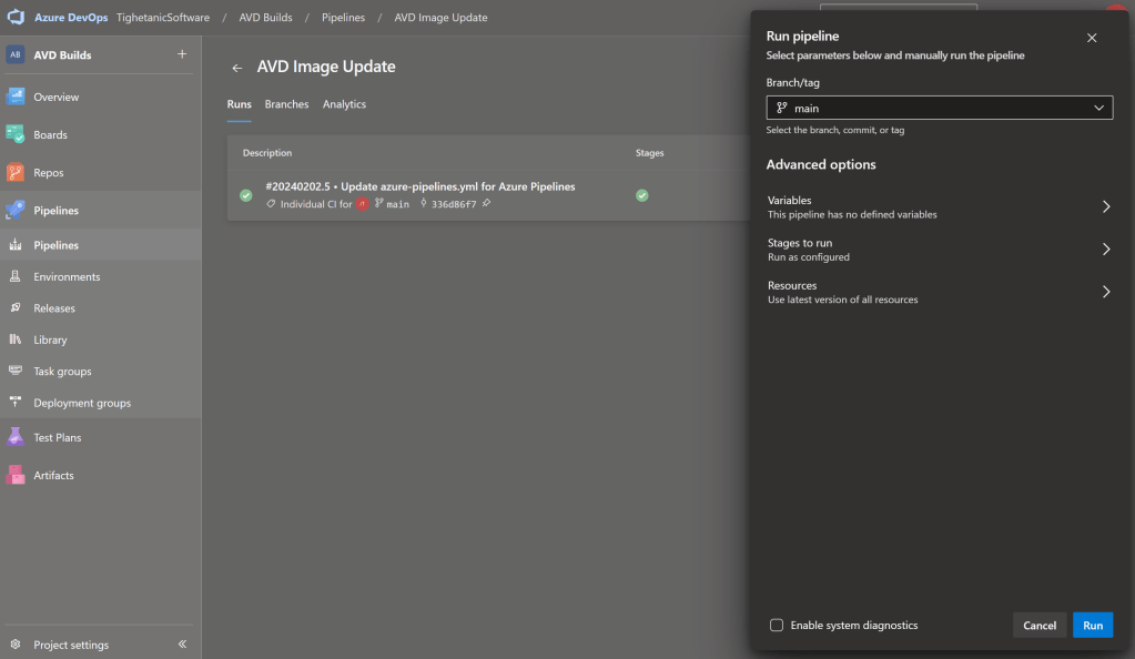 In order that I can use this same pipeline with both Secure Boot and Non-Secure Boot, I have set this to be populated from an existing variable group variable that I used in the AVD deployment itself. This means the update pipeline will run with the same settings.