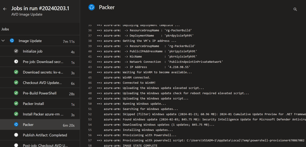 The pipeline can take a while to run, as it need to first create the temporary Azure VM, then install the Windows Updates (which can also take quite some time)